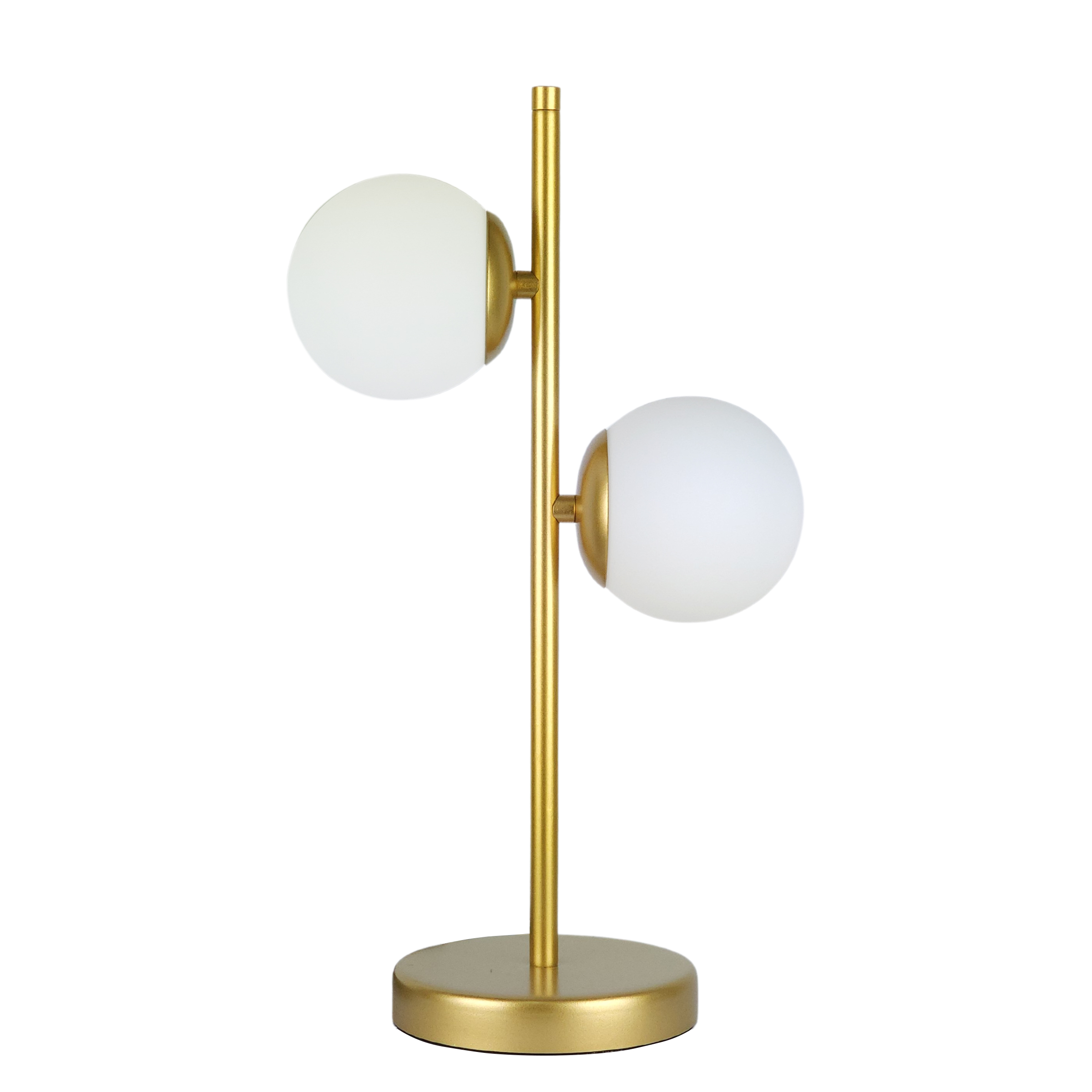 Design Contemporâneo com Detalhes Sofisticados: Com acabamento dourado metálico semi-brilho e dois globos de vidro branco fosco de 10 cm, este abajur combina forma e função em uma peça de destaque que complementa qualquer ambiente.